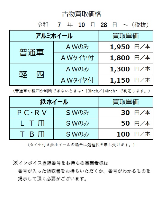 令和7年10月28日(火)よりアルミホイール買取価格を以下の通り改訂させて頂きます。