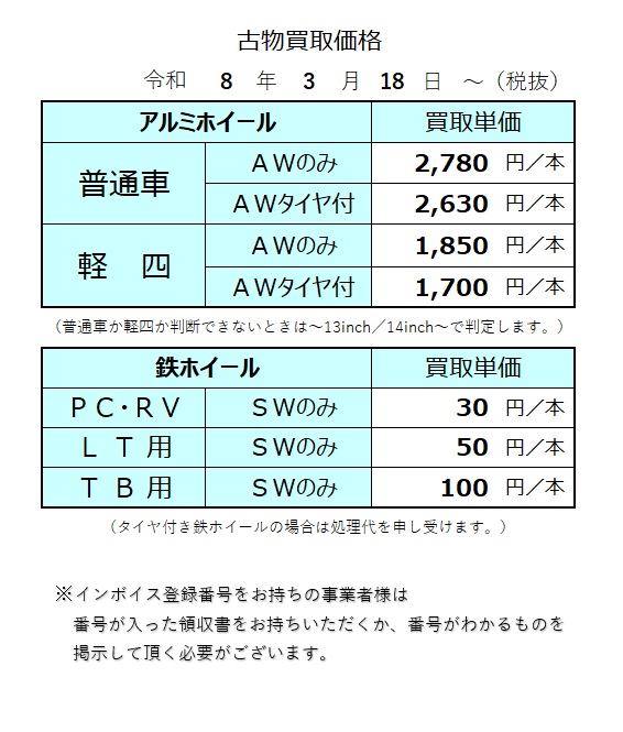 令和8年3月18日(水)よりアルミホイール買取価格を以下の通り改訂させて頂きます。